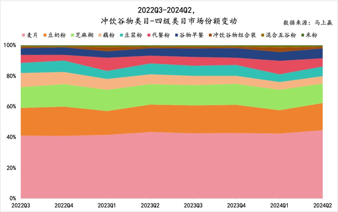 在冲饮谷物类目的四级类目占比情况中,可以看到麦片、豆奶粉、芝麻糊、藕粉、豆浆粉均占比较高,其余四级类目则占比较低。变化上来看,2022Q3-2024Q2时间段内,麦片的占比还在持续走高,藕粉、代餐粉则受挤压较为严重,占比持续降低。豆奶粉、芝麻糊、豆浆粉的占比基本维持稳定。