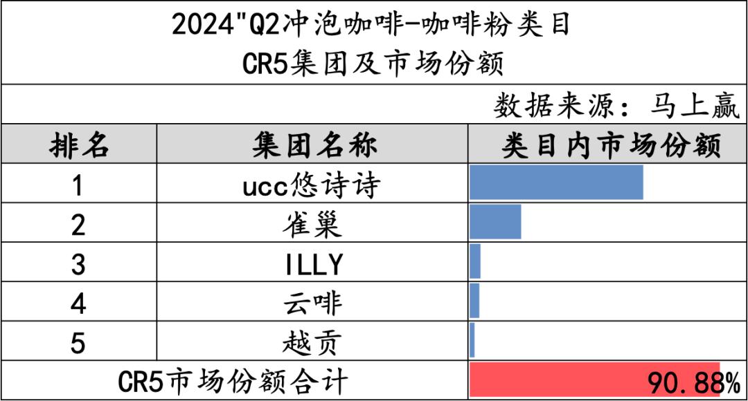 在占比最高的速溶咖啡类目中,CR5的市场份额合计96.80%,类目集中度非常高。 在类目内,雀巢的市场份额一骑绝尘,遥遥领先其他集团。