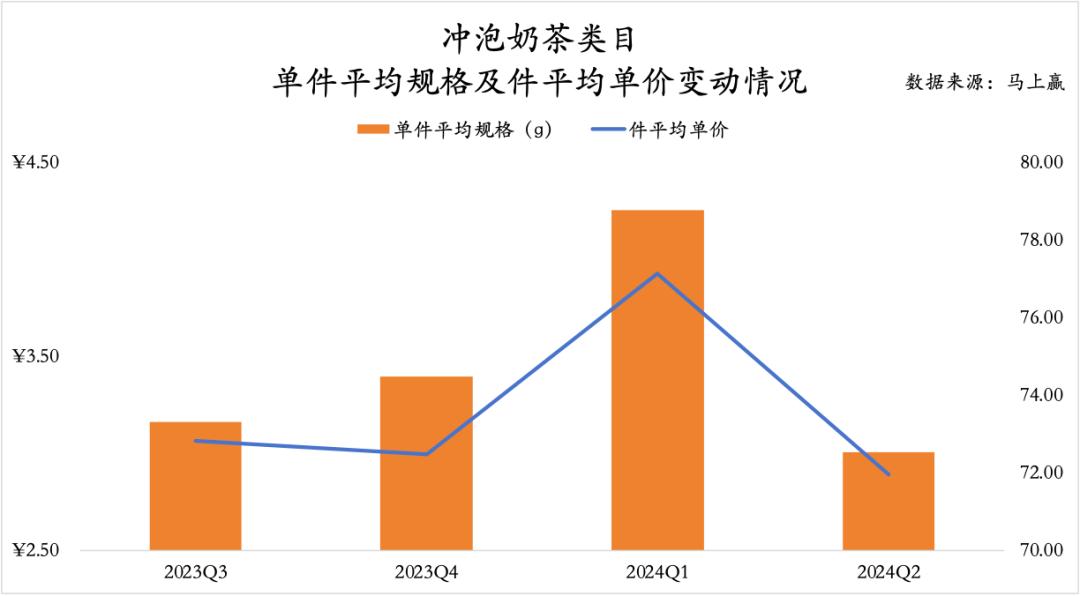 冲泡奶茶类目的平均规格、件平均单价走势与上述蜂蜜/蜂产品有相似之处,在Q1明显上涨,但在Q2回落到平均水平,甚至更低。整体来看,单件平均规格与件平均单价变动均呈正相关关系。