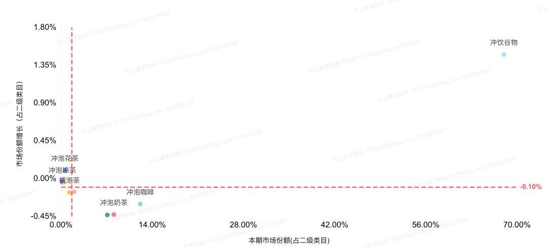 基于马上赢品牌CT中的品类机会洞察看板的四象限分析可以看到,在市场份额的划分上,冲饮谷物的地位一骑绝尘,与市场份额位居第二的冲泡奶茶拉开了超过50%的差距。在此之后是冲泡奶茶、蜂蜜/蜂产品,市场份额约占8%,冲泡果汁/粉和袋泡茶等类目市场份额都在1%左右。而从市场份额增速的角度看,冲调品中没有高速增长的类目,冲饮谷物以1.48%的增速排在第一位,市场份额较小的冲泡花茶和冲泡凉茶也保证正向增长,而冲泡咖啡、冲泡奶茶和蜂蜜/蜂产品这几类过去消费者极为熟悉和青睐的冲调产品,如今面临着市场份额负增长的局面。