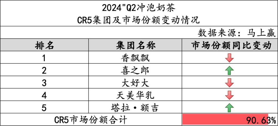 从类目CR5的情况来看,冲泡奶茶类目CR5合计90.63%,类目整体的集中度非常高。进入CR5的品牌中,香飘飘、大好大和天美华乳的市场份额同比下降,喜之郎和塔拉·额吉两个集团的市场份额同比有所上升。