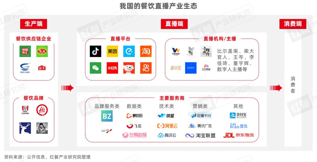 在餐饮行业发展和技术进步的推动下,餐饮企业、电商平台、内容平台、直播机构等都参与到餐饮直播的行列当中,它们围绕餐饮卖货、提升品牌形象和影响力等内容进行直播,促进餐饮直播产业链逐步走向成熟。