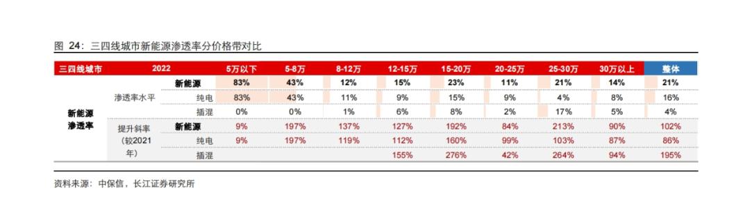 受益于腾势、问界、理想等品牌销量的快速上升, 自主品牌在高端车销量占比已经从2021年的1.38%快速上升到2023年的17.33%,县城汽车消费潮流快速向新能源汽车转型。