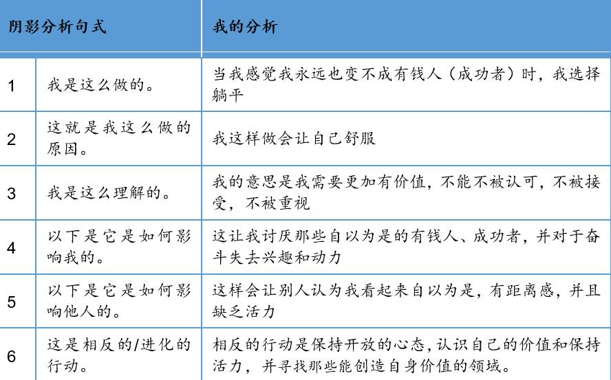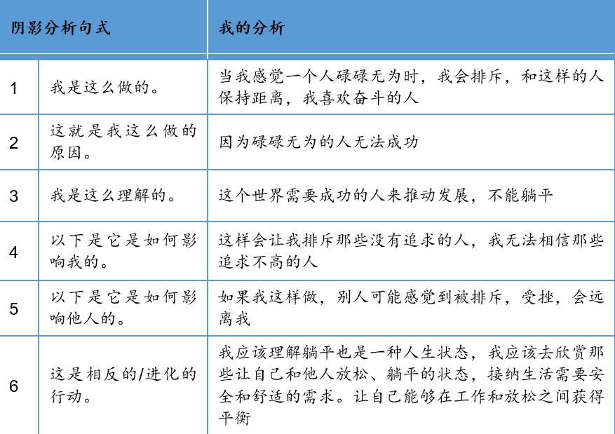 同样,也可以让一位选择躺平的人来看到自己的阴影,更加客观的应对自身的挑战。他可以展开如下阴影工作: