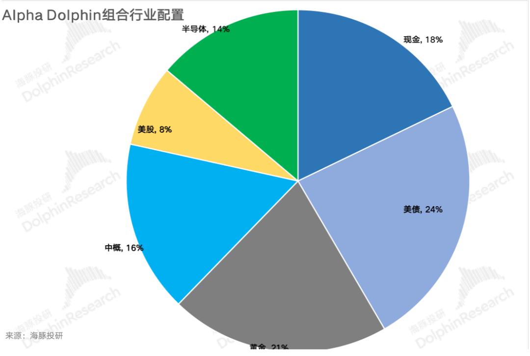 Alpha Dolphin虚拟组合共计持仓13只个股与权益型ETF,其中标配5只,8只权益资产为低配。其余分布在了黄金、美债和美元现金上。截至上周末,Alpha Dolphin 资产配置分配和权益资产持仓权重如下: