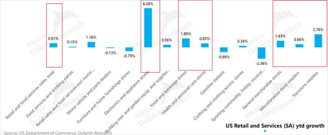 而如果平滑掉月份波动,看年初至今的变化,还是非常明显地呈现出刚需有韧性,而可选如汽车、家具家居、运动爱好普遍较差,而餐饮逐步走弱的趋势的消费增长放缓趋势,而不是闪崩或塌方的状态。
