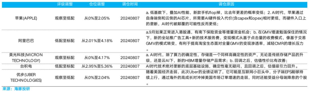 科技巨头中只谨慎的选择了苹果,海豚君认为它是属于硬件修复确定性比较强,而且AI时代投入代价相对较低,但结果的确定性又相对较高的。