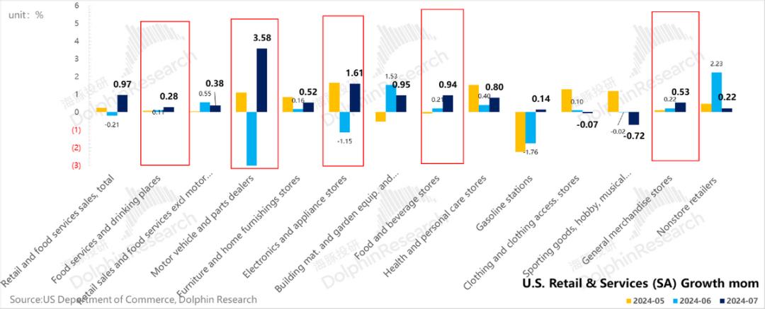 美国6月社零出来时,季调后月环比总数是负增长,一些人不看细分结构,就直呼美国的消费火车头歇菜了。结果7月就被打脸了,因为在社零中占比第一大类且月波动过山车的汽车与零部件零售环比增长又大幅度拉回来了。