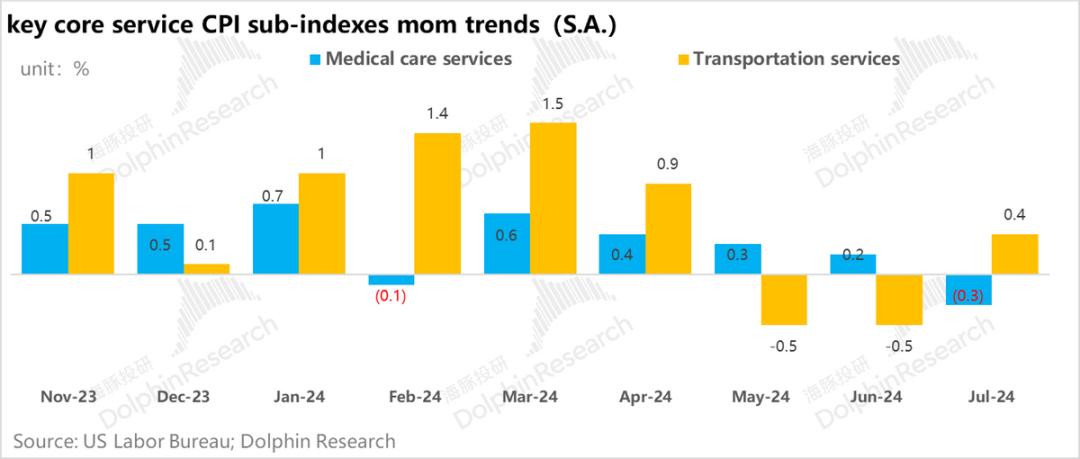 尤其是这波CPI的回落看起来似乎更具持续性:除了食品和能源两大高波动类目也已泄通胀、商品物价持续负增长看起来更似通缩的情况下,核心服务(不含居住成本)也在明显回落。比如说,比较关键的医疗物价和交通物价最近三个月似乎都在环比回落的趋势上。