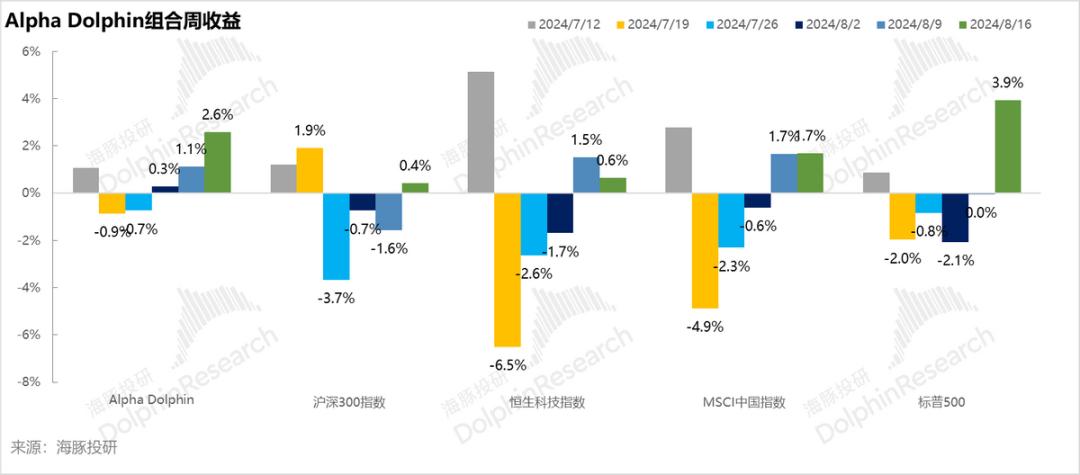 上周结束,组合收益上行2.6%, 跑赢中国资产指数——MSCI中国(+1.7%)、恒生科技指数(+0.6%)以及沪深300(+0.4%),但跑输标普500(+3.9%)。