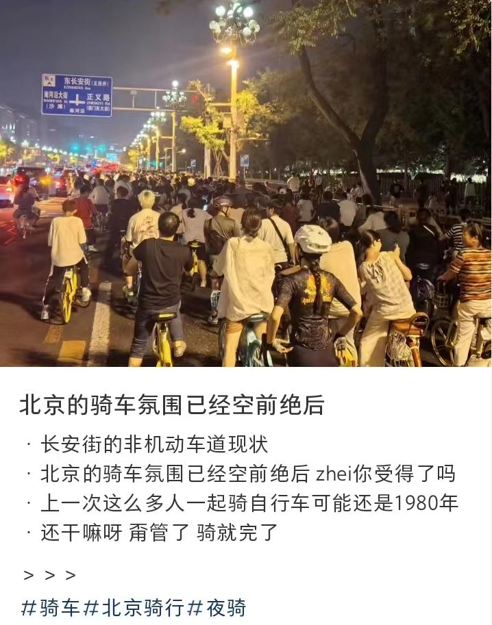 只不过,当这种旅游方式被社交媒体公之于众,更多想体验这种“廉价版快乐”的年轻人让长安街不堪重负,半夜“堵自行车”盛景更让体验降级且一降再降。