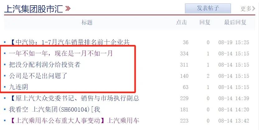 8月2日-8月14日,上汽集团连续十个交易日股价下跌。“公司是不是出问题了,十连跌”,“一年不如一年,现在是一月不如一月”,不少上汽集团股民纷纷吐槽称。