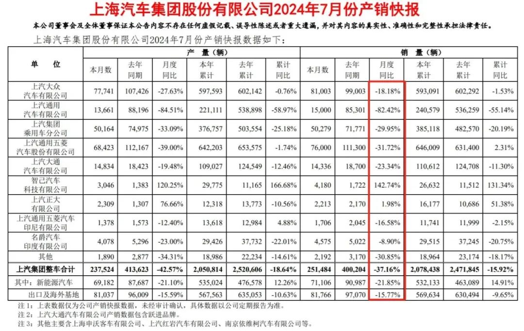 近日,上汽集团发布2024年7月份产销快报,交出了一份十分不理想的成绩单。