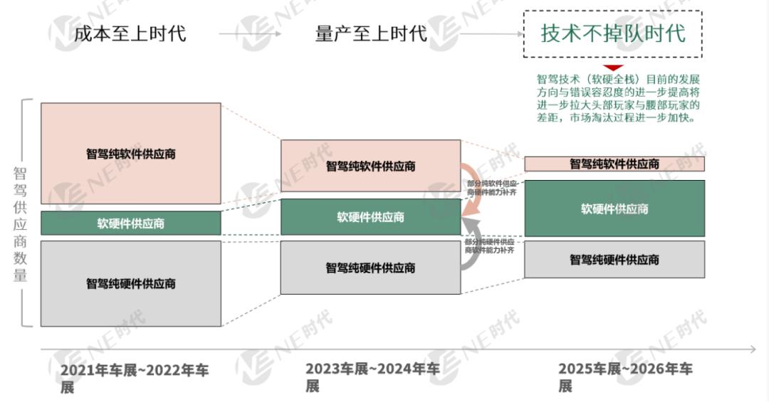 这份报告参照历年车展信息,提出了智驾市场的三个时代。三个时代按横向时间轴演进,纵向市场玩家则由多变少,体现了当前智驾市场的一个淘汰过程。