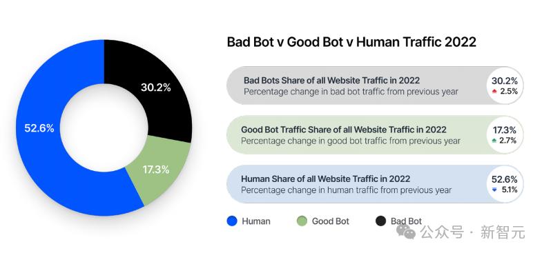 2022年,所有互联网流量的近一半(47.4%)来自机器人,比上一年增加5.1%。人类流量的比例(52.6%)降至八年来的最低水平