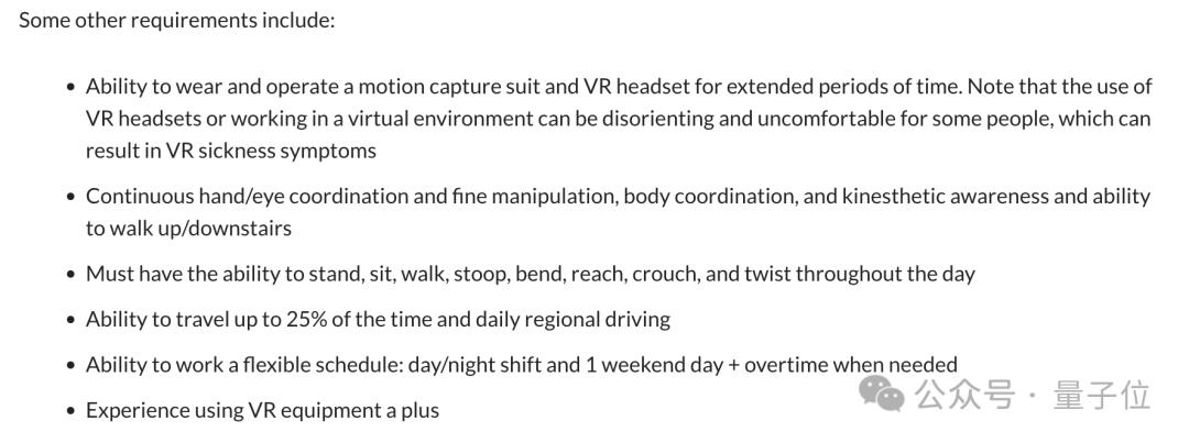 工作内容看起来很简单,主要是穿戴动作捕捉服和VR头盔,执行走路等指定动作,帮助机器人Optimus收集数据。
