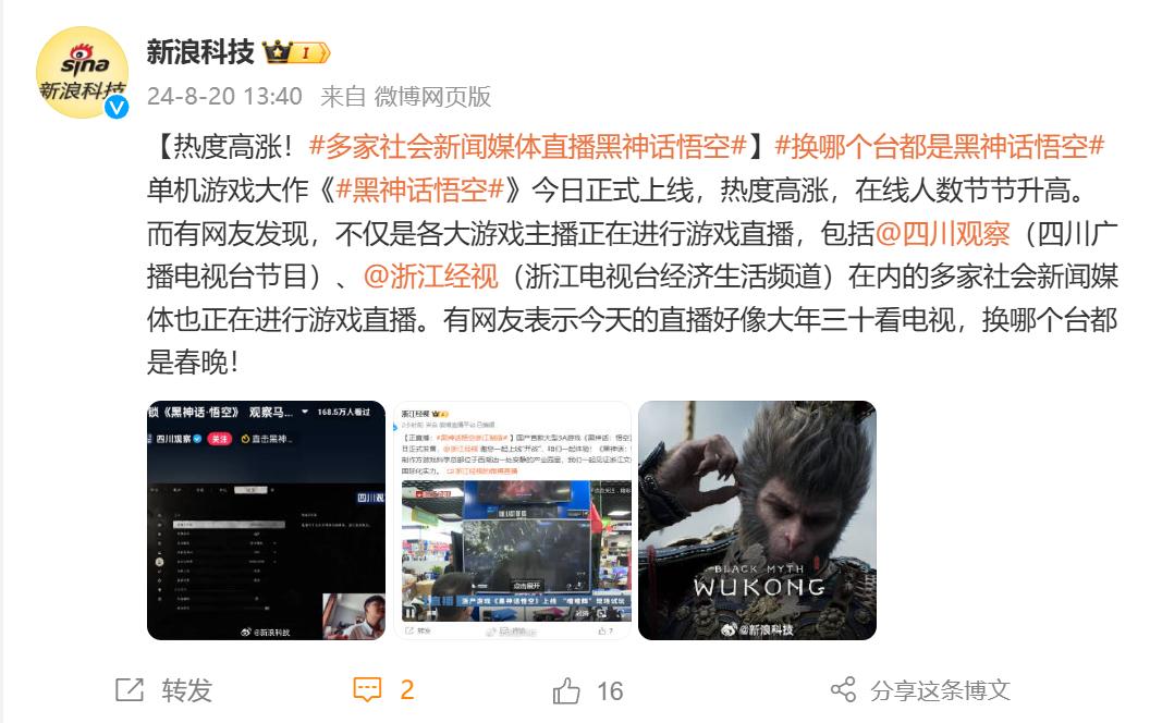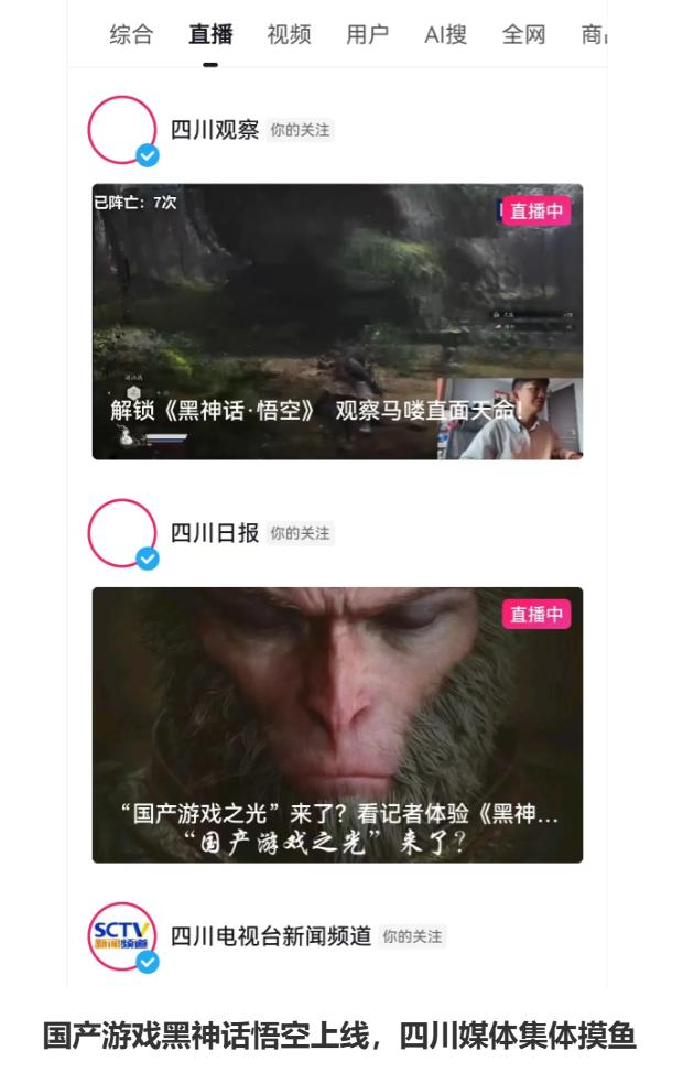 “所有有流量意识的官媒都在玩。今天没有直播玩黑神话的媒体,我觉得可以关门了,这点意识都没有,接下去更没运营的必要。”
