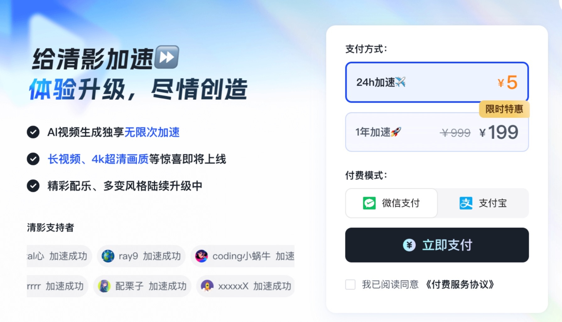 智谱清影推出的是“加速”模式。普通用户使用清影是无限次免费的,如果要想缩减排队等待生成的时间,可以购买加速券,5元加速一整天。