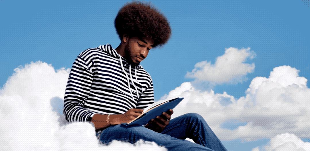 比如说,这是“一个留着爆炸头的20岁男子坐在一朵棉花云上,在蓝天中看书”文字描述所生成的视频。