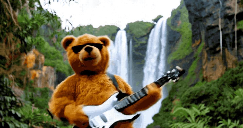 或者是,一只戴着太阳镜的泰迪熊在巨大的瀑布前,在丛林中弹奏电吉他,跳着舞并且摇头晃脑。