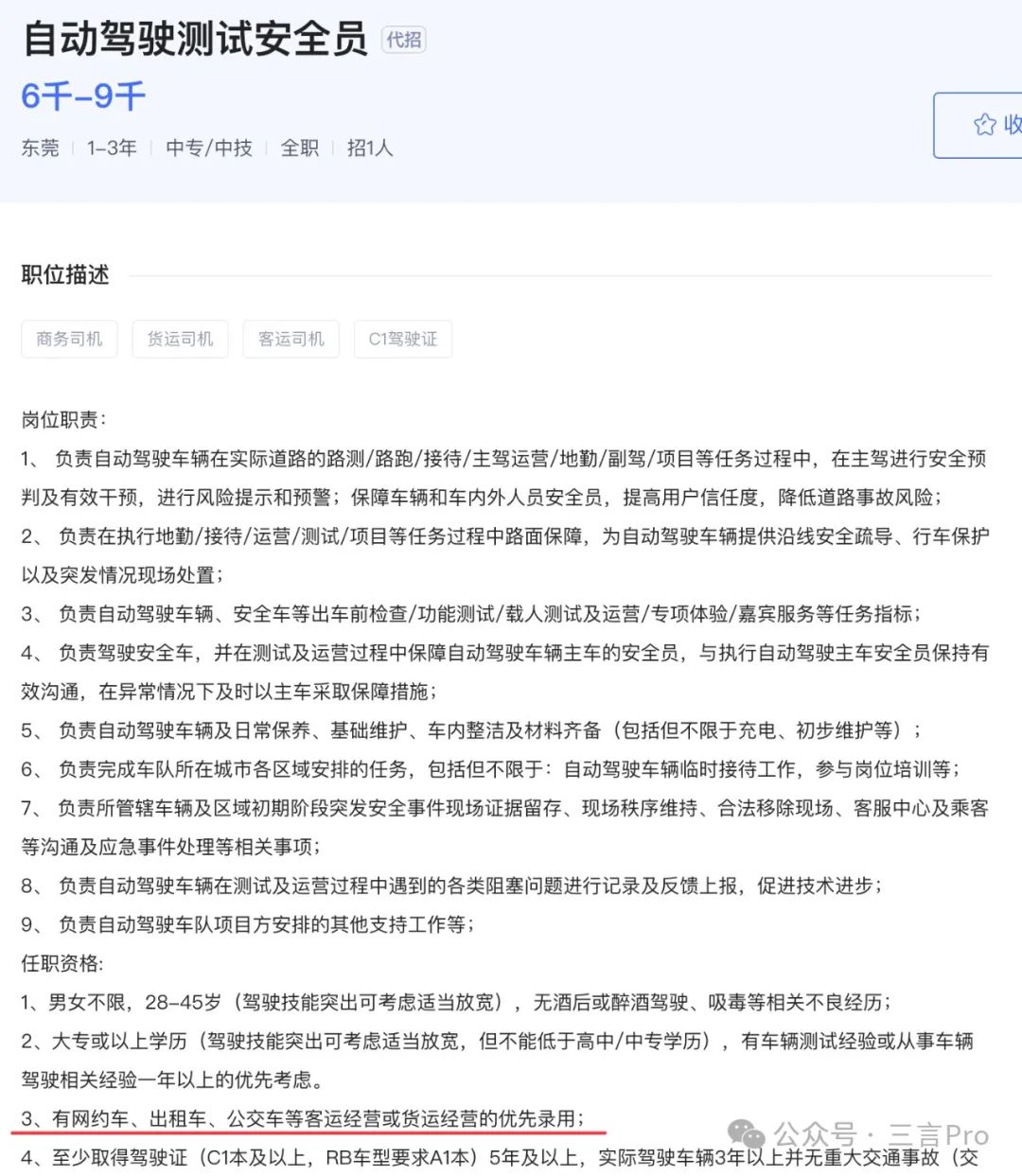 根据招聘平台信息显示,很多自动驾驶的企业大量招聘安全员。