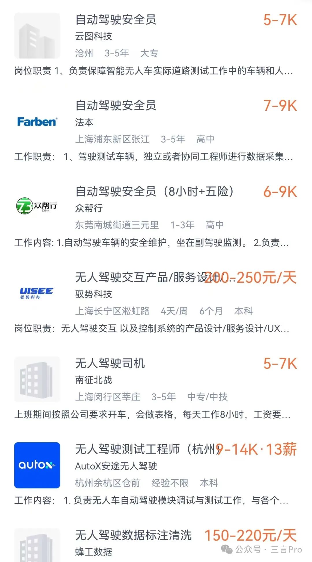 除此之外,很多企业都在热招自动驾驶安全员等相关工作,平均薪资在7-8千。