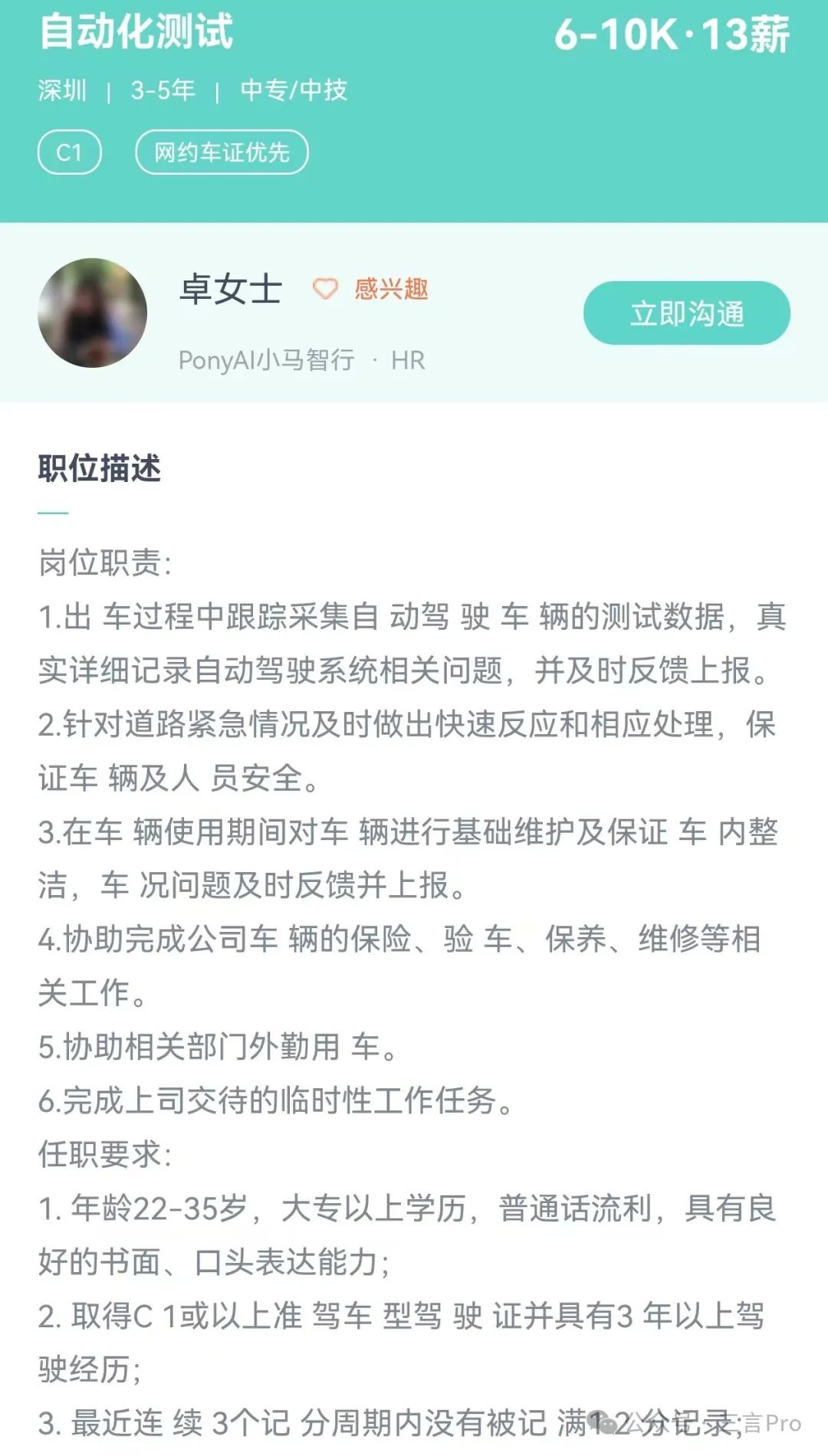 还有小马智行也在招聘自动化测试人员,负责采集自动驾驶车辆测试数据、维护车辆等工作,薪资待遇为6千至1万元。