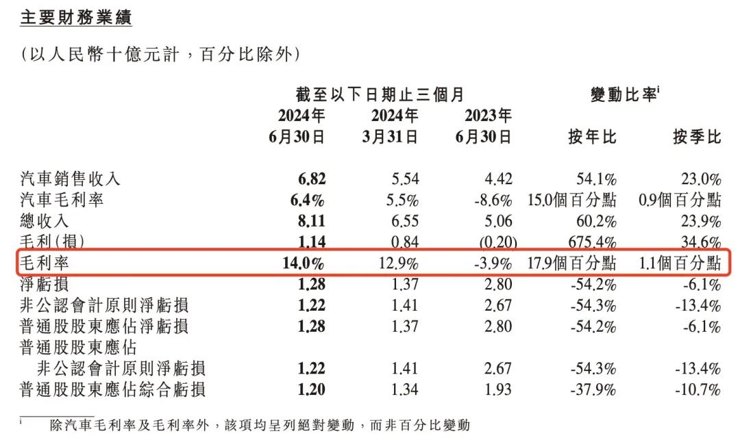 我们可以参考以往的财报数据,2022年一季度到2024年二季度的毛利率分别为12.2%、10.9%、13.5%、8.7%、1.7%、-3.9%、-2.7%、6.2%、12.9%、14%,这么来看,小鹏汽车已经实现 连续四个季度毛利率增长。