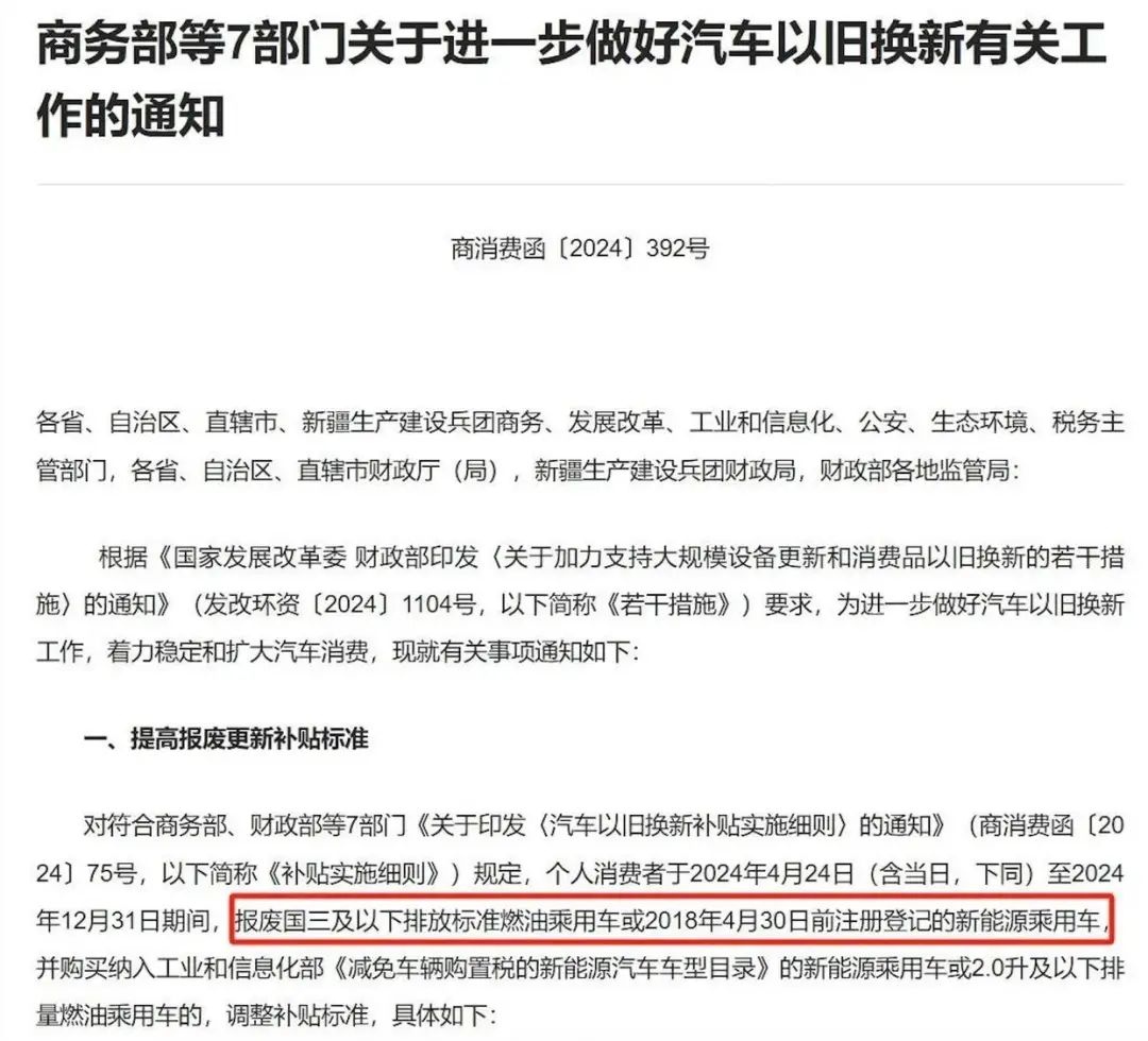 今年年初,商务部等7部门联合印发《汽车以旧换新补贴实施细则》,具体来看消费者在相应时间范围内报废国三及以下排放标准燃油乘用车或2018年4月30日前注册登记的新能源乘用车,并购买符合条件的新车,可享受一次性定额补贴。对购买新能源乘用车的补贴1万元;对购买2.0升及以下排量燃油乘用车的补贴7000元。