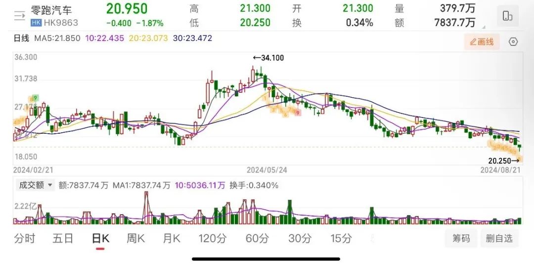 这样的预期下,零跑汽车的股价却不断下跌, 8月15日财报发布后,截止发稿时,股价累计下跌了7.51%。最近两个交易日甚至有加速下跌的趋势。20号那个交易日下跌超过4%,21日这个交易日盘中一度下跌超过5%,