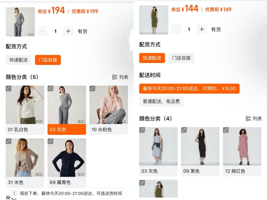 而本次和淘宝小时达合作,则是官方亲自下场,在淘宝优衣库店铺下单后,可选择快递配送(配送费9元)及门店自提两种方式,配送时间在 2 至 3 个小时。