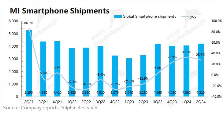 量:2024年第二季度小米智能手机出货量4220万台,同比增长28.3%。