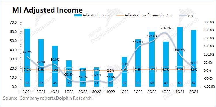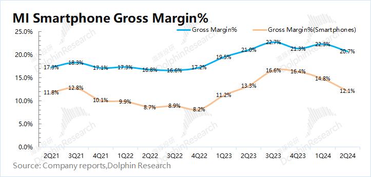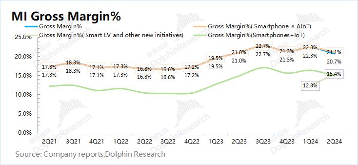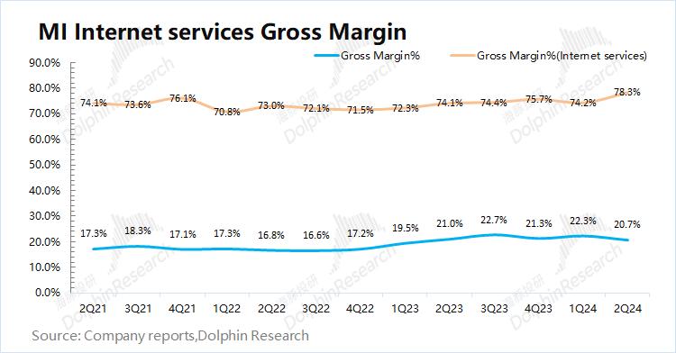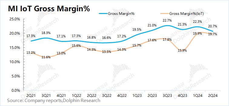 小米集团2024年第二季度毛利率20.7%,同比下滑0.3pct,好于市场预期(19.7%)。