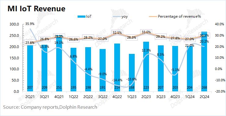 2024年第二季度小米 IoT 业务实现营收268亿元,同比增长20.2%。IoT业务本季度继续回升,主要得益于中国大陆的大家电业务以及海外市场的平板和可穿戴产品的收入增长。