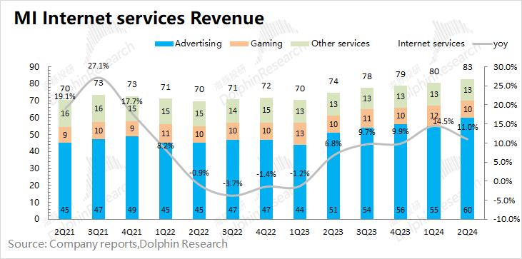 2024年第二季度小米互联网服务业务实现营收82.7亿元,同比增长11%,在公司总营收占比9.3%。