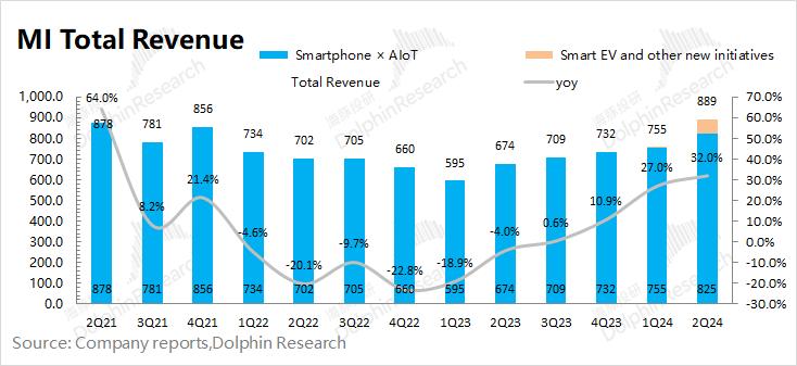 小米集团2024年第二季度总营收889亿元,同比增加32%,好于市场预期(868亿元)。公司本季度的收入增长,主要来自于传统业务的增长和新增的汽车业务双重带动。