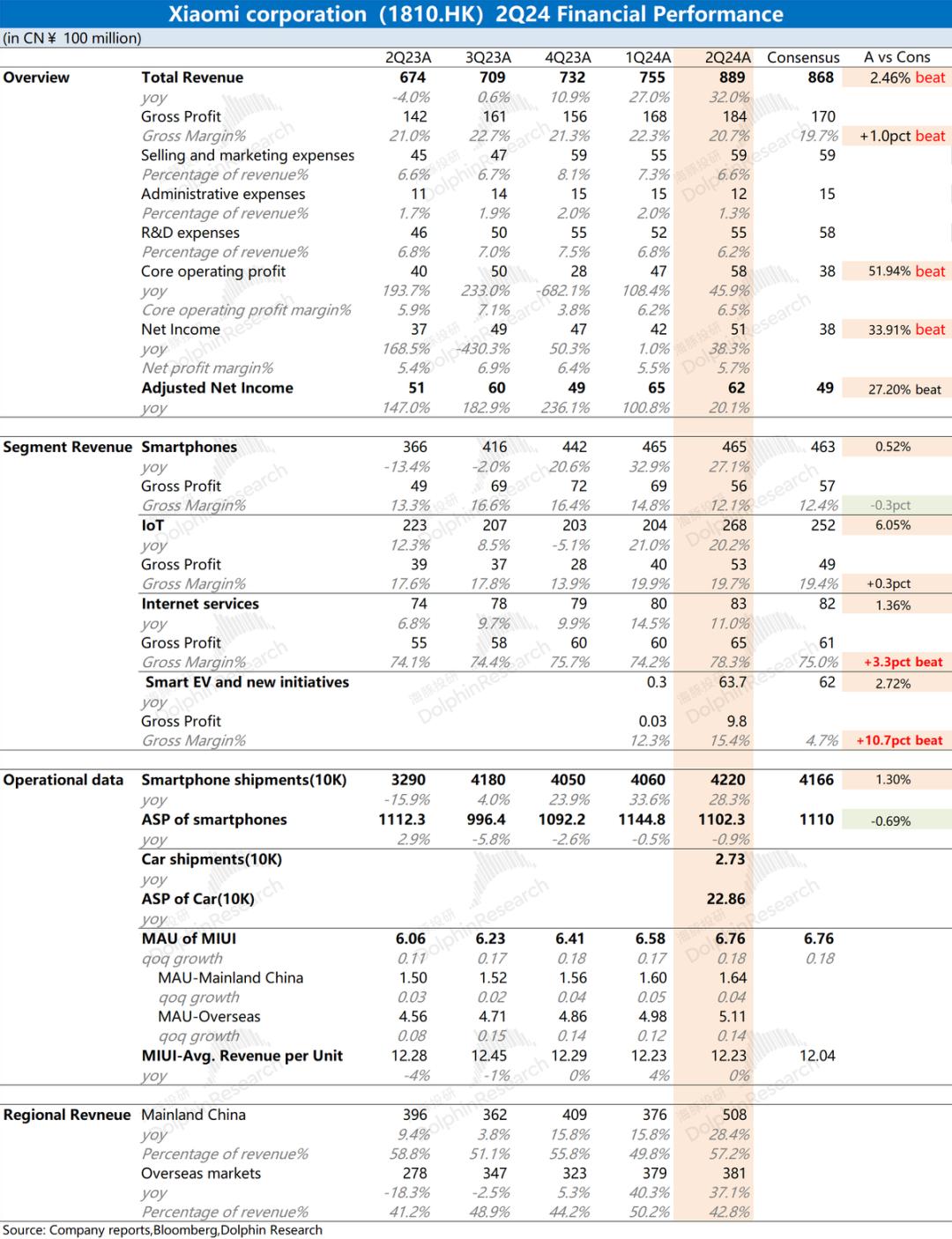 1.整体业绩:收入&毛利率,都好于预期。小米集团本季度总营收889亿元,同比增长32%,好于市场预期(868亿元)。公司本季度的收入增长,主要来自于传统业务(手机X AIoT)的增长和新增的汽车业务双重带动。小米集团本季度毛利率20.7%,同比下滑0.3pct,好于市场预期(19.7%)。本季度毛利率有所下滑,主要是受季节性促销等政策的影响以及汽车业务毛利率略低于公司的整体水平;