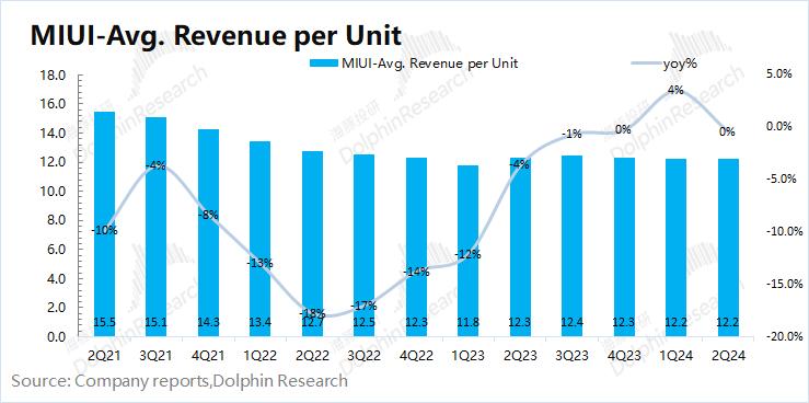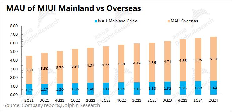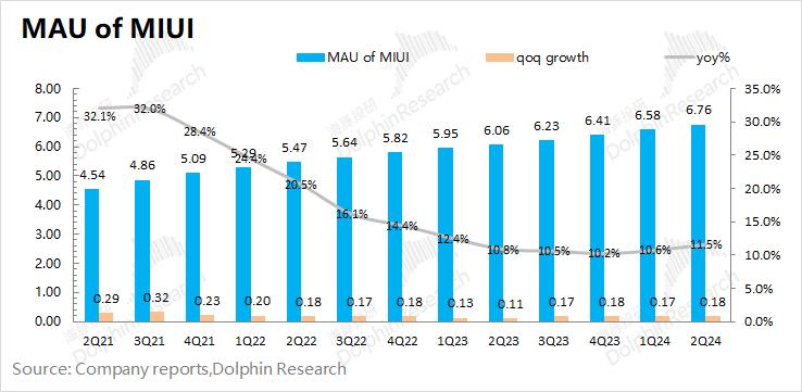 MIUI 用户数:截止到2024年6月,MIUI 月活跃用户数达到6.76亿,同比增长11.5%,本季度MIUI用户增速有所回升,用户数保持着两位数的扩张速度。