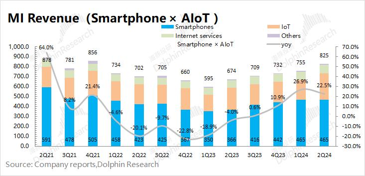 1)本季度小米的手机X AIoT业务(传统业务)实现营收825亿元,同比增长22.5%。本季度手机、IoT及互联网服务三大分项业务都有不同程度的增长;