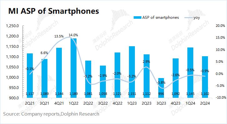 价:2024年第二季度小米智能手机出货均价1102元,同比下滑0.9%。