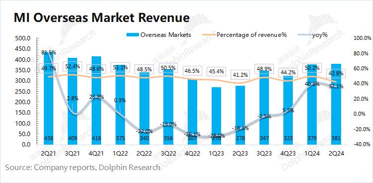 2024年第二季度小米海外收入381亿元,同比增长37.1%,收入占比下滑至42.8%。本季度海外收入占比下降,主要是财报中汽车业务的新加入。