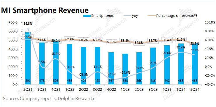 2024年第二季度小米智能手机业务实现营收465亿元,同比上升27.1%。公司手机业务在本季度的增长主要得益于出货量的稳步回升。