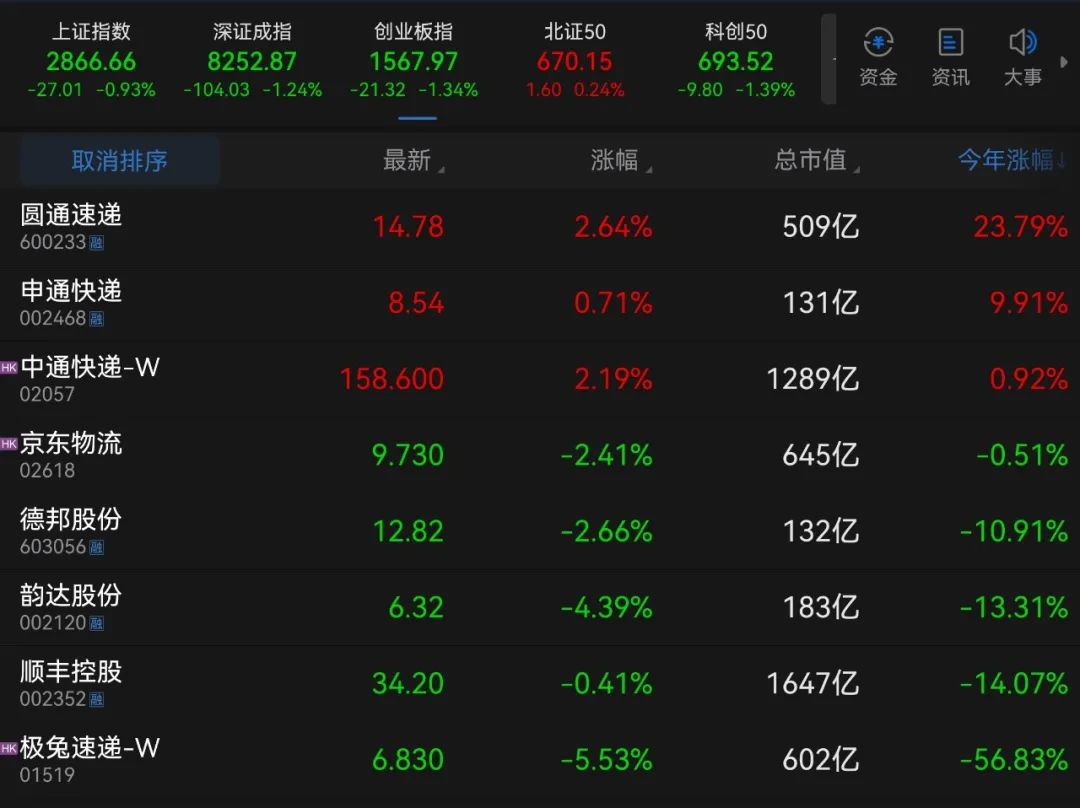 截至8月20日收盘,顺丰最新市值为1647亿元、中通为1289亿港元、京东物流645亿港元、极兔602亿港元、圆通509亿元。