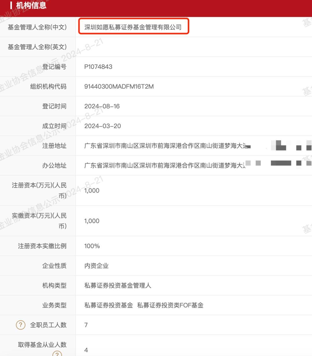 协会网站信息显示,如愿私募基金在今年8月16日完成私募管理人登记,机构类型是私募证券投资基金管理人,目前公司有7名全职员工,注册和办公地点都在广东省深圳市南山区。