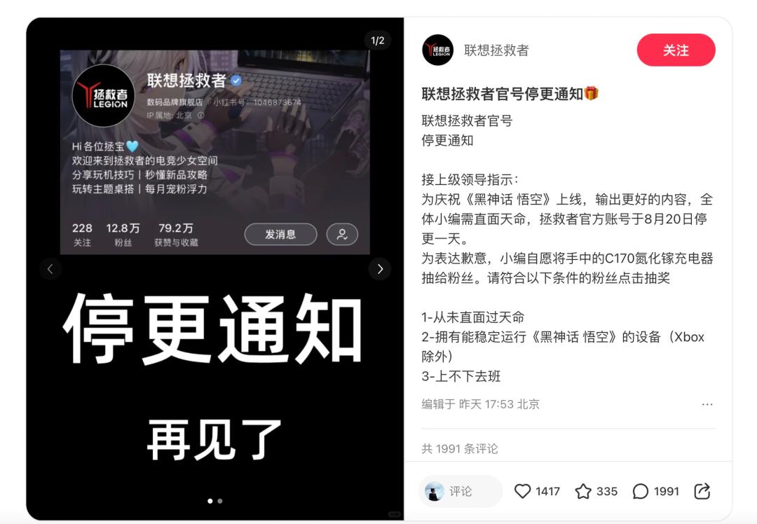 一些公司账号“停更”。例如和《黑神话》有联名合作的“联想拯救者” (联想拯救者系列是联想公司于2015年06月上市的14英寸游戏影音本) ,在官方账号宣布:为了庆祝《黑神话:悟空》上线,全体小编需直面天命 (去打游戏) ,停更一天。