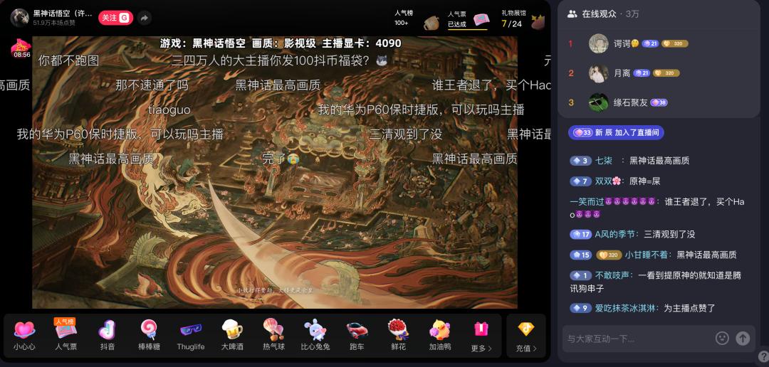 许多对游戏不感兴趣的“外行人”,也被《黑神话:悟空》的热度所吸引,来直播间凑个热闹。