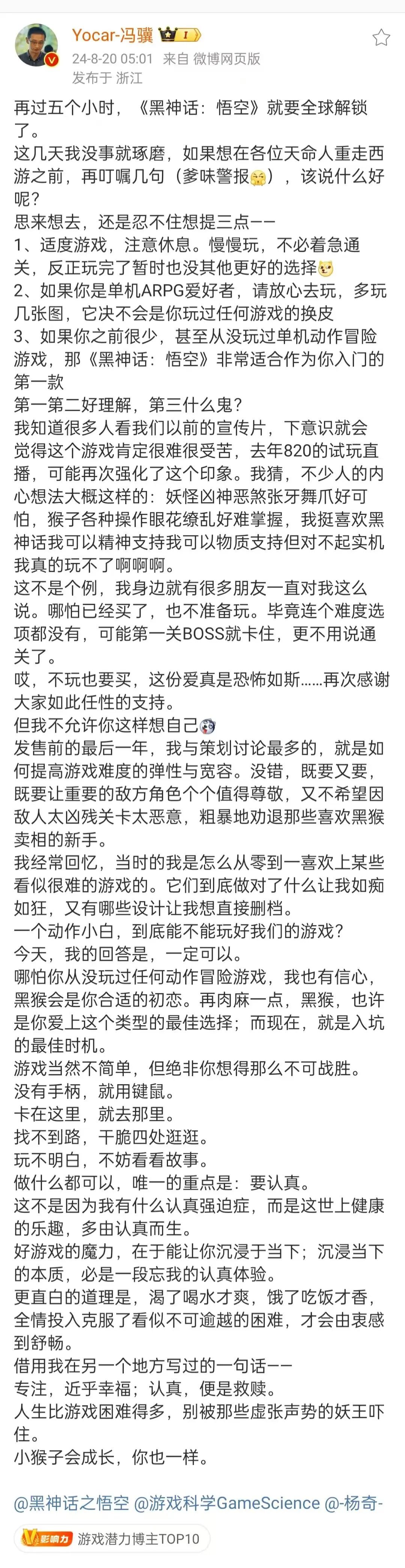 有人说,《黑神话:悟空》的诞生是理想主义大获全胜,甚至连冯骥自己也坦言,游戏不简单,但绝非不可战胜,做什么都可以,唯一的重点是:要认真。2024 年 8 月 20 日凌晨 5 点,《黑神话:悟空》全球解锁 5 小时前,冯骥在微博写下这样一段话: