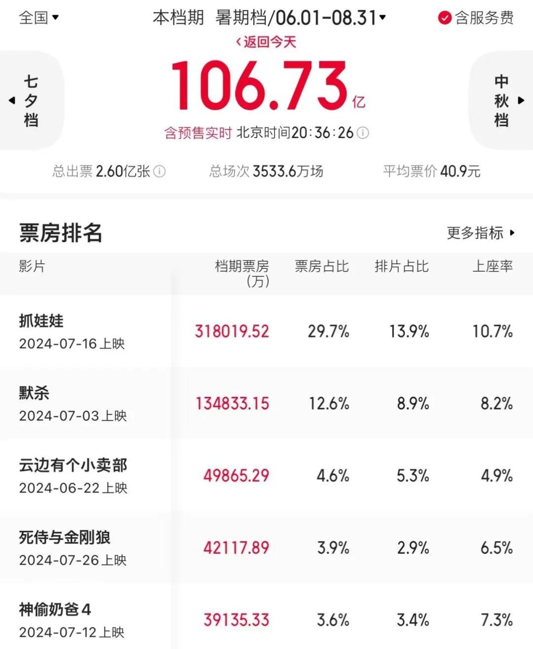 根据猫眼专业版显示,截至8月22日,2024年暑期档总观影人次2.6亿,去年暑期档档期总观影人次则是5.04亿。具体到上座率方面,去年暑期档上座率超10%的项目多达13部,其中有3部影片上座率超15%,而今年仅有《抓娃娃》一部影片上座率达到10%。