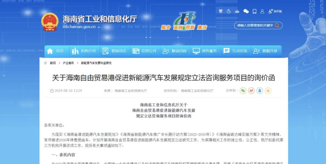 而为确保研究的独立性和公正性,海南省将委托第三方机构进行调研,调研内容涵盖海南新能源汽车的发展现状、面临的挑战及立法需求,并分析新能源汽车发展过程中的难点、痛点和堵点问题,并提出针对性的建议和对策,以促进新能源汽车在海南的普及。