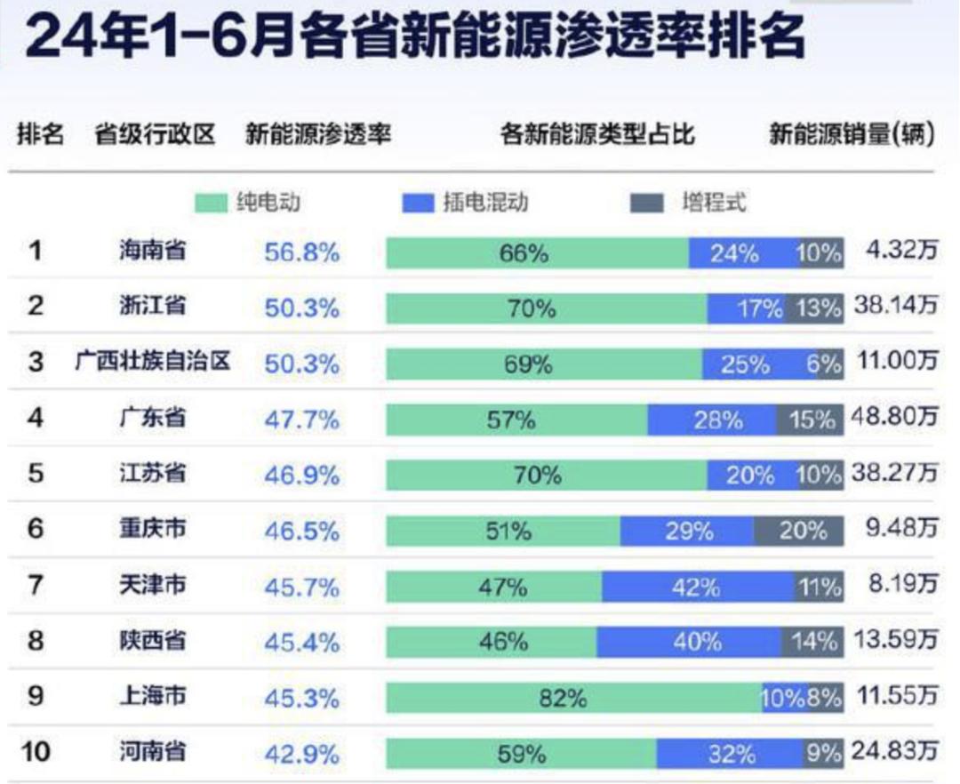 而在全省均大力发展新能源的情况下,海南也成为新能源车占比最高的省份。今年上半年,海南新能源车占比高达56.8%,为全国首位,大幅领先浙江的50.5%和广西的50.3%。